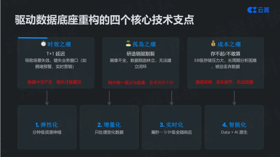 第三个痛点是成本之痛 。EB级的存储压力巨大,长周期分析困难,许多企业被迫采取"激进采样"策略——丢弃大部分数据,只保留部分样本。但这种做法丢失了大量细节,无法回溯历史,当业务需要做深度分析时才发现数据已经不在了。更糟糕的是,由于存储和计算资源捉襟见肘,企业陷入"存不起、不敢算"的困境,数据虽然产生了,但却无法充分利用。