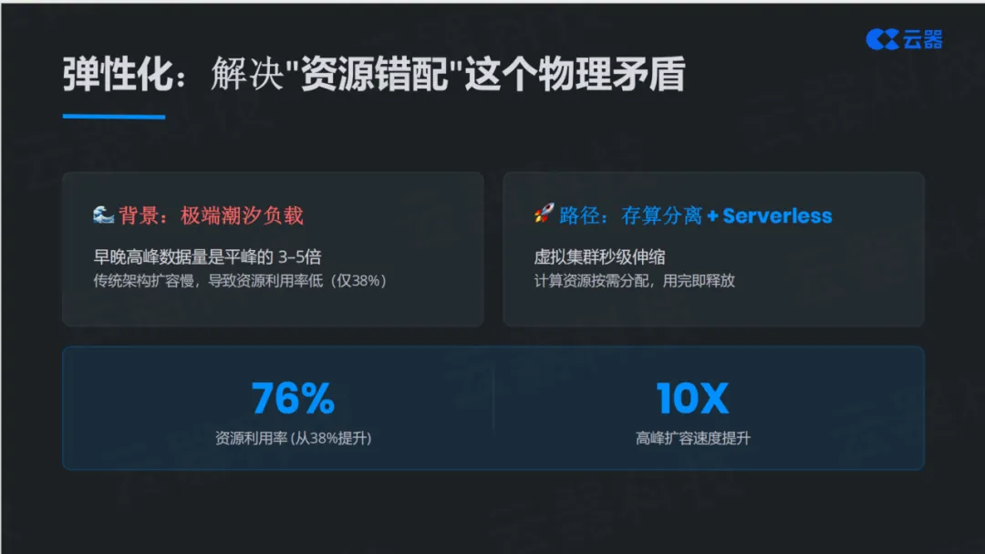 弹性化的路径是存算分离加Serverless。通过虚拟集群秒级伸缩,计算资源可以按需分配、用完即释放。白皮书披露的数据显示,资源利用率可以从传统架构的38%提升到76%,高峰扩容速度提升10倍以上。这不仅仅是成本优化,更是让系统具备了呼吸的能力——根据业务负载自动调节资源,就像人的呼吸会根据运动强度自动调节频率一样。