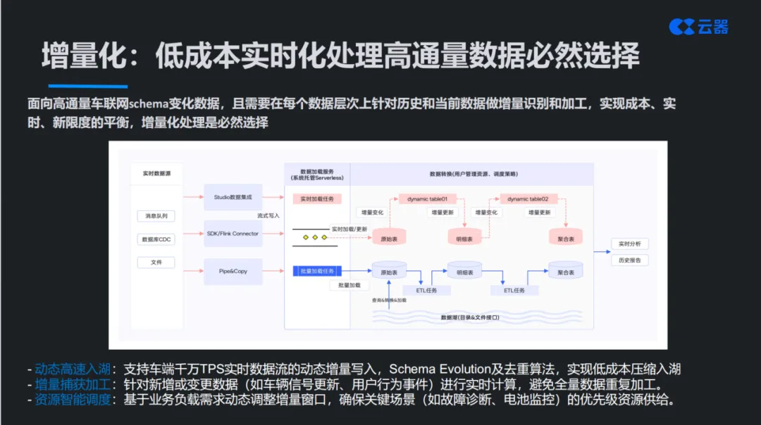 增量化在车联网场景尤其重要,因为数据具有高通量、Schema变化频繁的特点,且需要在每个数据层次上针对历史和当前数据做增量识别和加工。白皮书总结了三个关键能力:动态高速入湖(支持车端千万TPS实时数据流的动态增量写入,Schema Evolution及去重算法,实现低成本压缩入湖)、增量捕获加工(针对新增或变更数据进行实时计算,避免全量数据重复加工)、资源智能调度(基于业务负载需求动态调整增量窗口,确保关键场景的优先级资源供给)。