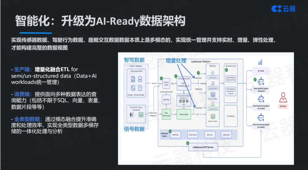 智能化要求在三个层面实现突破:生产端实现增量化融合ETL,支持半结构化和非结构化数据,让Data+AI workloads统一管理;消费端提供面向多种数据表达的查询能力,包括但不限于SQL、向量、表量、数据片段等;全类型数据通过模态融合提升准确度和处理效率,实现多模存储的一体化处理与分析。