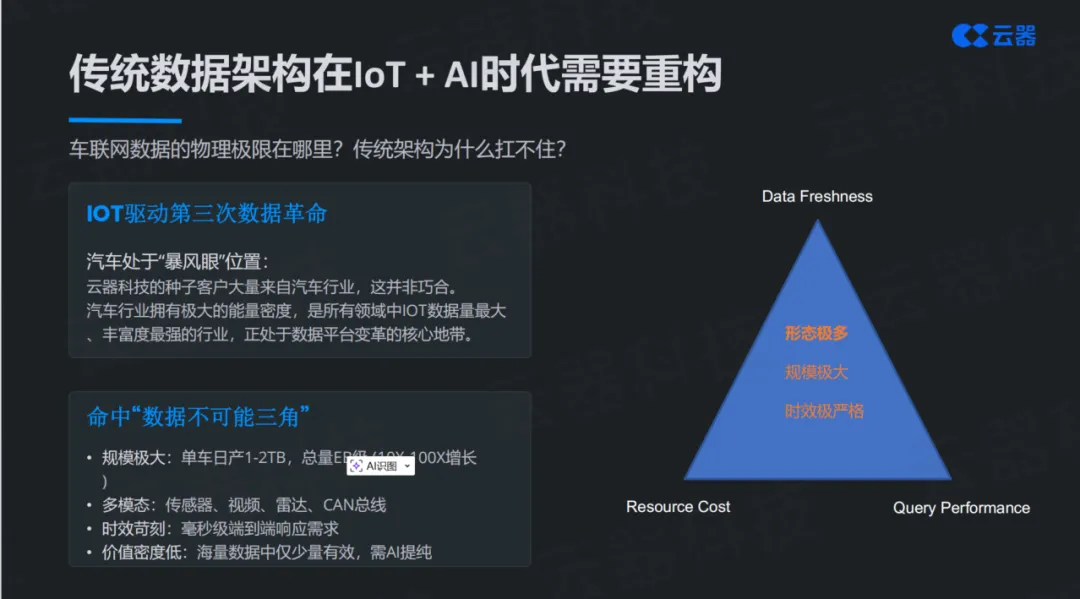 更关键的是,车联网数据完美命中了"数据不可能三角"的三个极端条件。在传统数据架构中,资源成本(Resource Cost)、数据新鲜度(Data Freshness)和查询性能(Query Performance)往往无法同时满足,只能在其中做取舍。但车联网场景对这三者都有极端要求:既要处理EB级的海量数据(成本压力),又要毫秒级到分钟级的实时响应(时效要求),还要在海量数据中快速检索和分析(性能需求)。